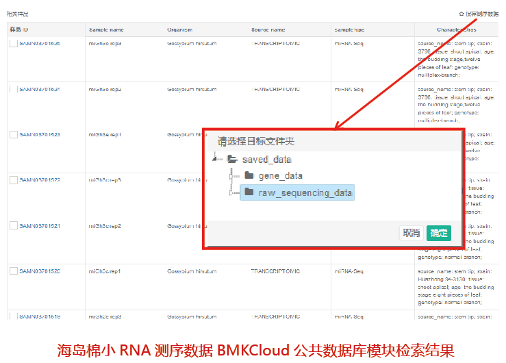 2)使用上述公共數(shù)據(jù)鑒定海島棉中的microRNA及各自的前體序列。該步驟可將在BMKCloud平臺(tái)目錄下保存的PRJNA284336項(xiàng)目數(shù)據(jù)直接導(dǎo)入BMKCloud 小RNA分析平臺(tái) 完成。