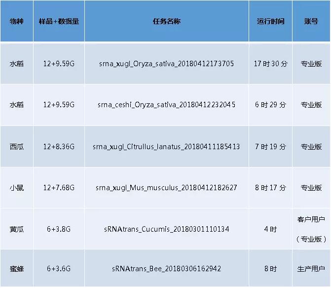 sRNA分析數(shù)據(jù)表明,水稻12個(gè)樣本,共9.59G,在專(zhuān)業(yè)版賬號(hào)中最快可以6小時(shí)29分完成分析。另外,在客戶(hù)專(zhuān)業(yè)版賬號(hào)中,6個(gè)黃瓜樣本,共3.8G數(shù)據(jù),最快4小時(shí)完成分析任務(wù)。