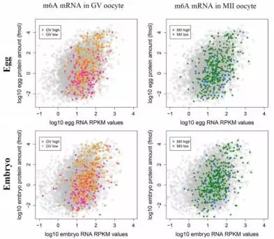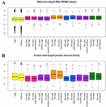 為了探索mRNAs甲基化是否與翻譯有關(guān),作者把mRNA甲基化數(shù)據(jù)與Smits等人已發(fā)表的轉(zhuǎn)錄組和蛋白組數(shù)據(jù)進行了整合。通過BLAST分析,在RNA/蛋白數(shù)據(jù)中找到了723個m6A修飾mRNAs的信息。GV期或者MII期卵母細胞中高m6A峰的RNA水平(log10 RNA RPKM值)比總RNA高(在卵或者胚胎中),但是蛋白水平(log10 protein amount / fmol)比總蛋白水平低(Figure 2)。與高度甲基化的mRNAs相比,低甲基化RNAs顯示出非常高的表達水平(Figure 3)。這些結(jié)果說明在卵母細胞或早期胚胎中,m6A修飾可能與mRNA翻譯有關(guān)。