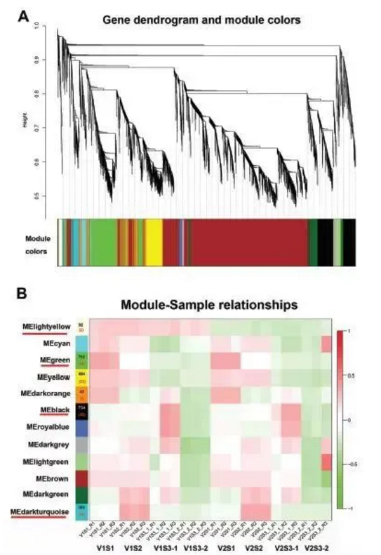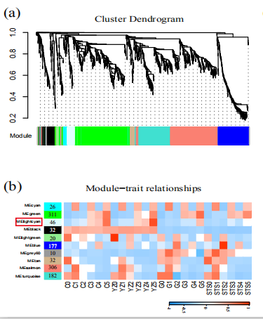 然后作者利用高分文章利器:WGCNA分析,進(jìn)行數(shù)據(jù)深度挖掘和整理,推薦大家使用百邁客云平臺小工具WGCNA模塊,可以出來和作者同樣高大上的圖片。