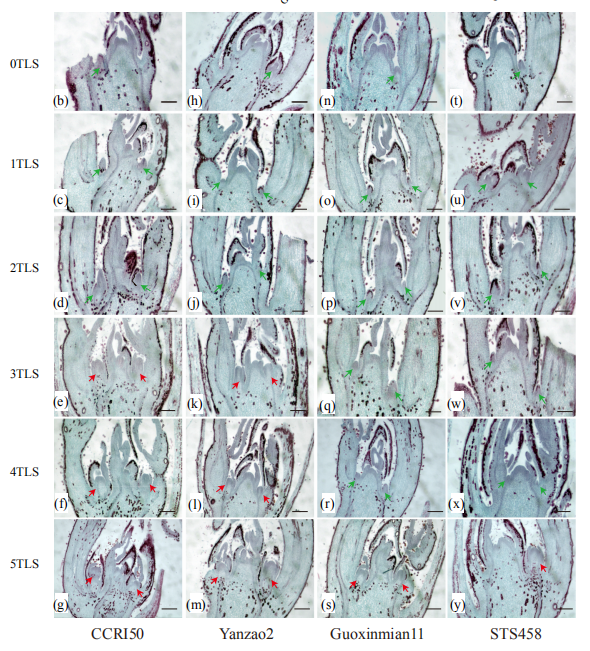 陸地棉(Gossypium hirsutum L.)是世界上最重要的纖維作物。在我國黃河流域和長江流域棉區(qū),實(shí)現(xiàn)早熟棉在小麥或者油菜后直播可以提高復(fù)種指數(shù)。而在西北內(nèi)陸棉區(qū),春季氣溫低,秋季枯霜早,早熟棉既能提高棉花的霜前花率,還可以改善棉花品質(zhì)?;ㄑ糠只怯绊懚碳久奁贩N早熟的重要性狀,是棉花現(xiàn)蕾期、開花期和成鈴期發(fā)育的基礎(chǔ),花芽分化直接影響開花時間?;ㄑ糠只侵参飶臓I養(yǎng)生長向生殖生長過渡的標(biāo)志。當(dāng)進(jìn)入生殖生長時,側(cè)芽變成花芽,花芽發(fā)育成果枝。果枝分化決定了開花量、生殖能力和棉花產(chǎn)量。因此,早熟性狀及早熟棉品種在生產(chǎn)上顯得尤為重要。