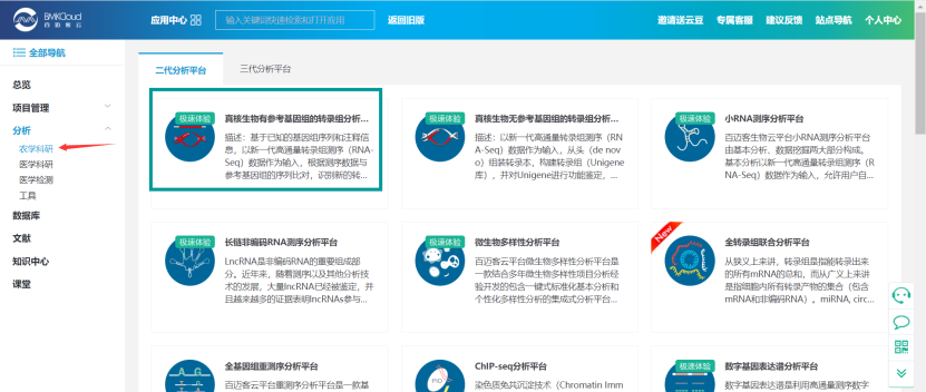 百邁客云包含農(nóng)學(xué)和醫(yī)學(xué)兩大類分析平臺,醫(yī)學(xué)分析平臺主要針對人、鼠數(shù)據(jù)的分析,包含:轉(zhuǎn)錄組、非編碼RNA、單基因病外顯子、腫瘤外顯子、重測序等數(shù)據(jù)分析,以及全轉(zhuǎn)錄組聯(lián)合分析;農(nóng)學(xué)分析平臺可以應(yīng)用到更多的物種,涵蓋轉(zhuǎn)錄組、非編碼RNA、微生物、蛋白、代謝等數(shù)據(jù)的分析,以及全轉(zhuǎn)錄組聯(lián)合分析等。點(diǎn)擊左側(cè)導(dǎo)航分析->農(nóng)學(xué)或者醫(yī)學(xué)打開分析平臺列表頁面,點(diǎn)擊選擇您想要使用的分析平臺,打開其詳細(xì)介紹頁面,該頁面可以看到該平臺的應(yīng)用領(lǐng)域“平臺介紹“技術(shù)背景“案例“課堂“版本記錄,點(diǎn)擊打開軟件即可進(jìn)入到參數(shù)頁面。