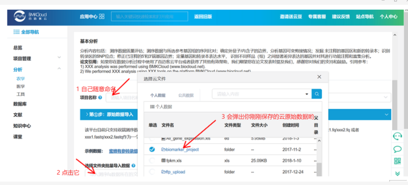 為了方便數(shù)據(jù)、任務(wù)和報告的管理,我們將同屬于一個項目的內(nèi)容會放到一個項目中,因此進(jìn)行基本分析時需要先選擇一個項目,如果沒有項目也可以點(diǎn)擊+新建先創(chuàng)建一個項目,見下圖。